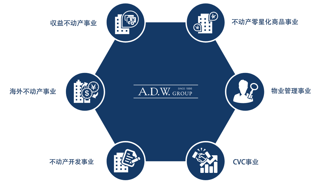 ADWG集团的事业由收益不动产事业,不动产零星化商品事业,海外不动产事业,物业管理事业,不动产开发事业,CVC事业之六大事业构成。